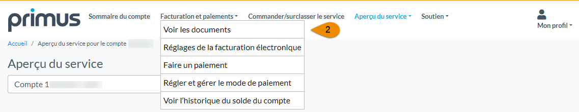 - Si vous avez plus d'un compte enregistré sur MyPrimus, sélectionnez le compte que vous souhaitez consulter dans le menu déroulant.